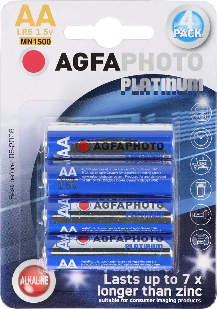 | Im Paket | 4 × AGFA PHOTO Mignon AA Alkaline Batterien (LR06, 1.5 V) |