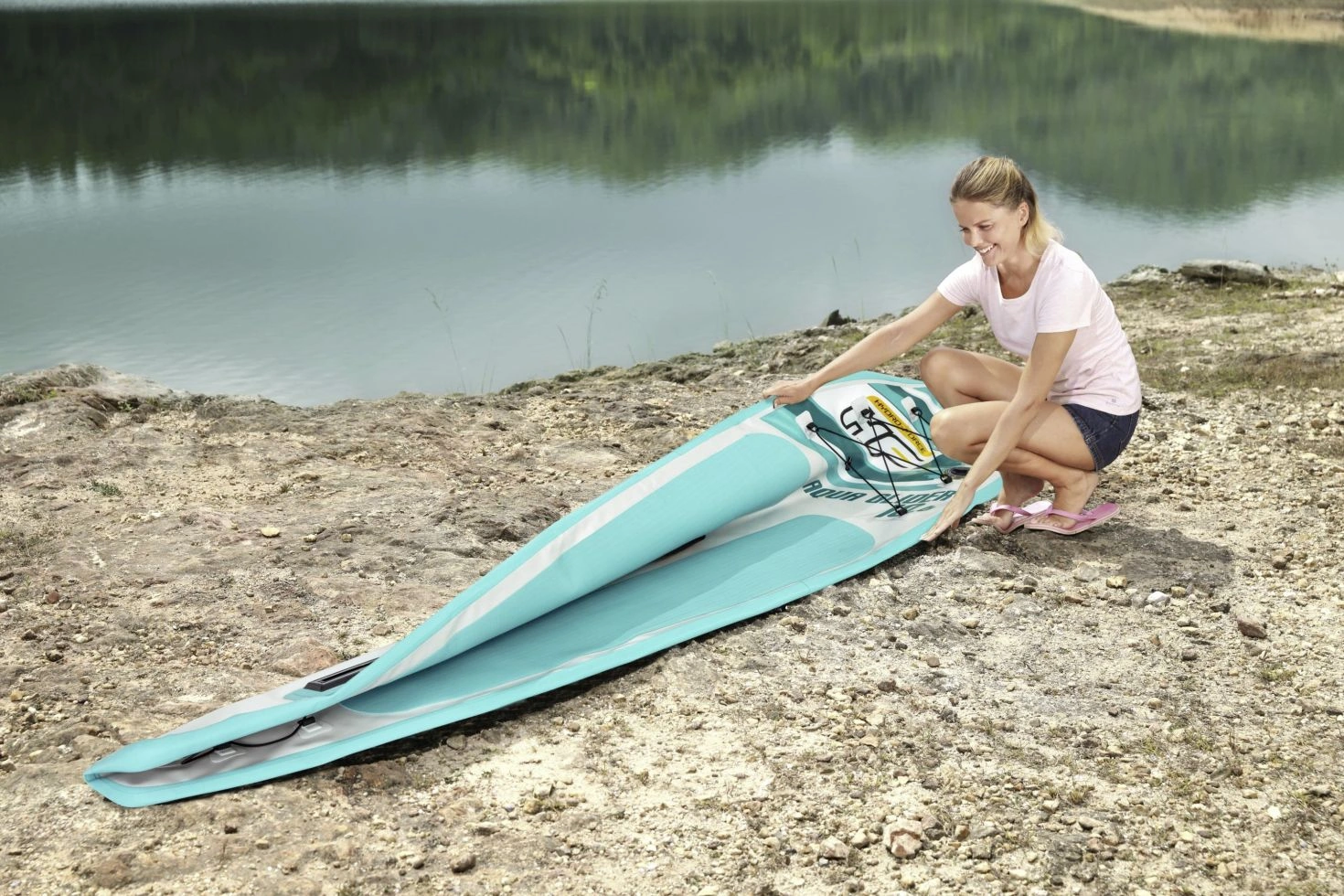 Ein rutschfestes Deckpad unterstützt sicheren Stand, der zentrale Tragegriff erleichtert den Transport. Zwei abnehmbare Finnen sorgen für Spurtreue. Mit der Handpumpe rasch einsatzbereit; nach der Tour über das Ventil entlüften und dank platzsparender Faltkonstruktion kompakt verstauen.