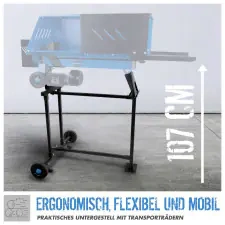 Das stabile Untergestell sorgt für eine angenehme Arbeitshöhe und ergonomisches Arbeiten. Ein hochwertiges Hydrauliksystem, eine Sicherheitsabdeckung im Spaltbereich sowie die 2-Hand-Sicherheitsbedienung gewährleisten maximale Sicherheit nach aktuellen Standards. Fahrgriff und Transporträder erleichtern das Bewegen des Geräts.