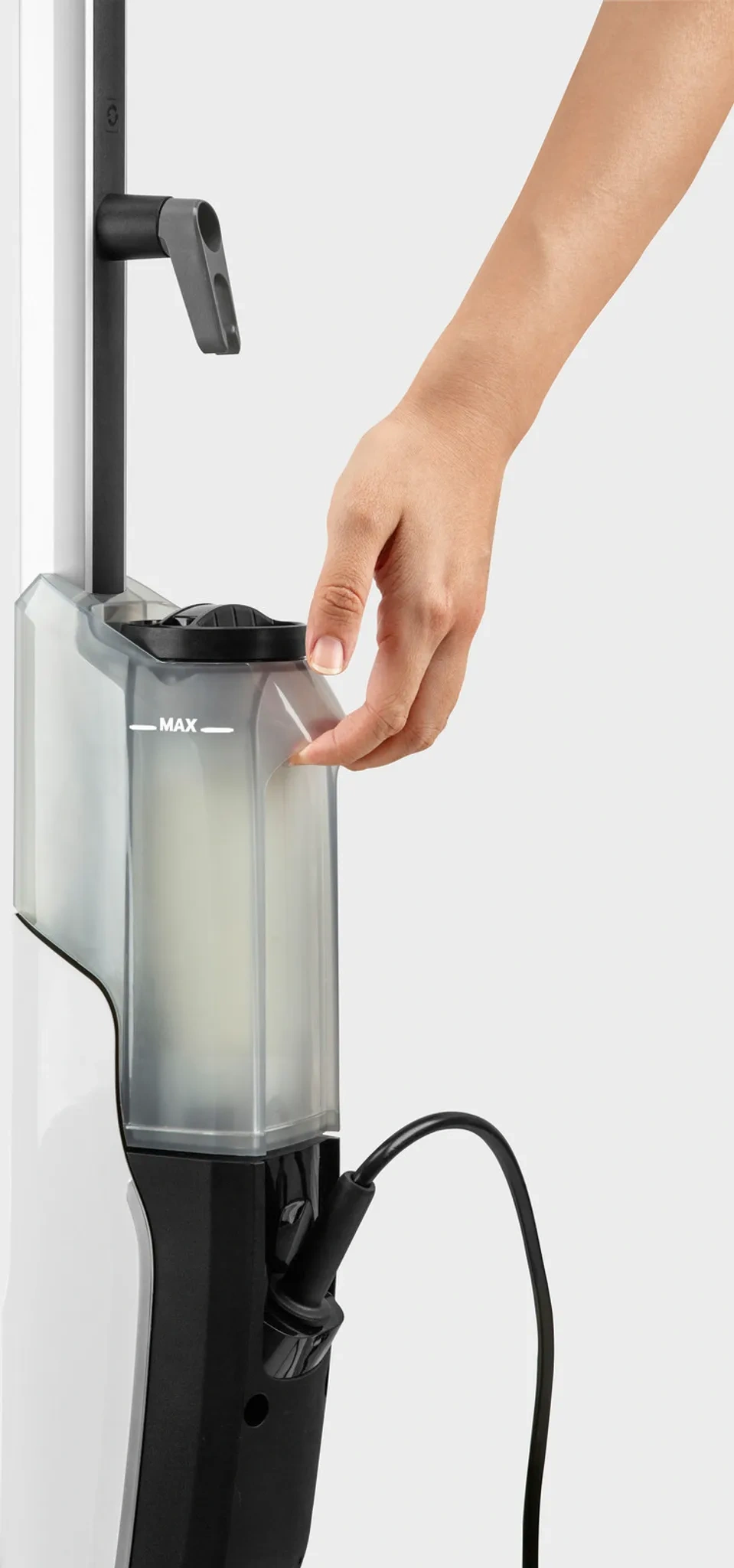 Die integrierte Entkalkungskartusche befreit das eingefüllte Wasser automatisch von Kalk und verlängert so die Lebensdauer des Geräts. Das flexible Düsengelenk sorgt für optimalen Bodenkontakt in jeder Position. Mit dem EasyFix-Klettsystem lässt sich das Mikrofaser-Bodentuch hygienisch wechseln, ohne es zu berühren – für schnelles und komfortables Reinigen im ganzen Haushalt.