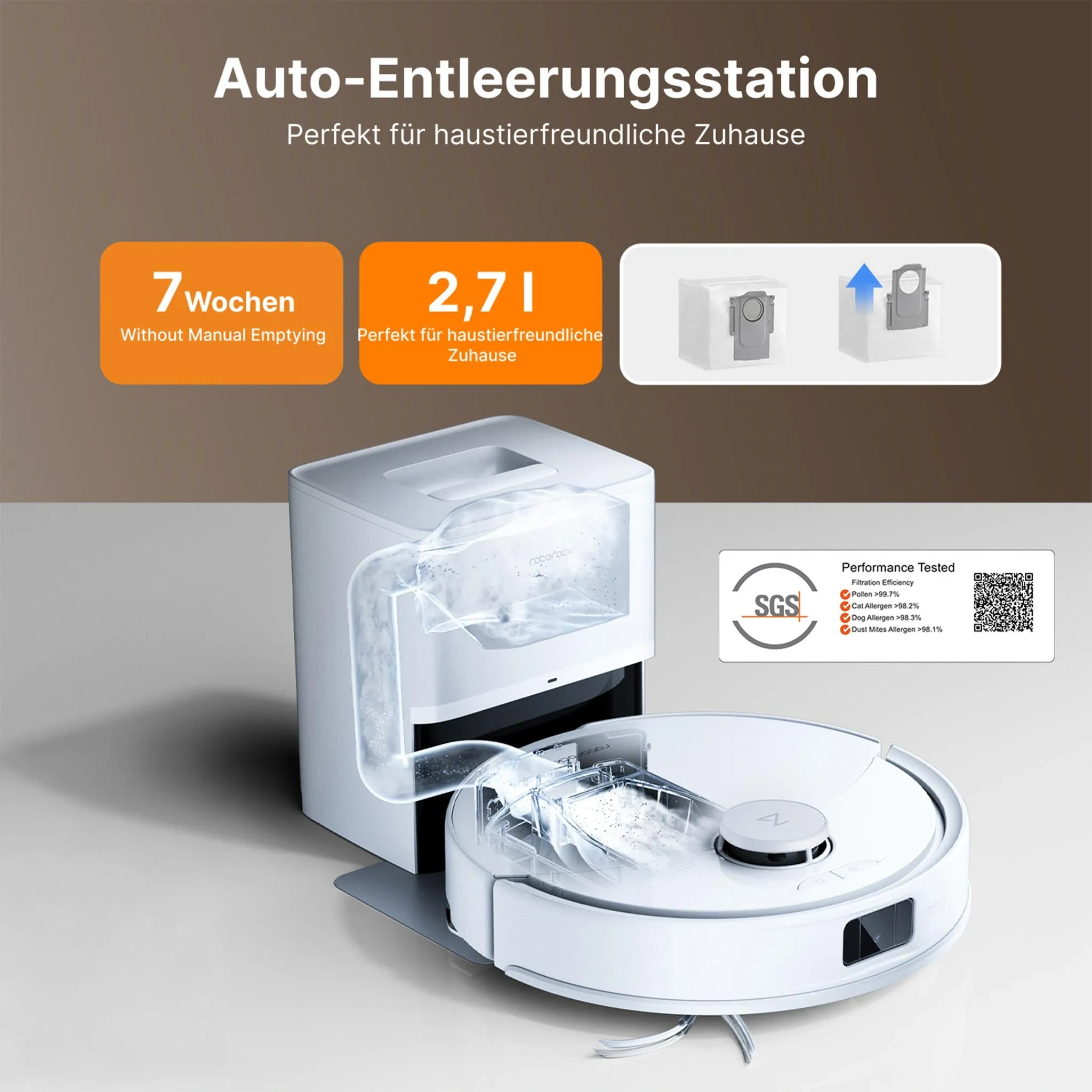Highlights: 10.000 Pa HyperForce® Saugkraft, Dual Anti-Tangle-System, intelligentes Auto-Lifting-Mopping, PreciSense® LiDAR-Navigation, automatische Entleerung für bis zu 7 Wochen und smarte App- & Sprachsteuerung.