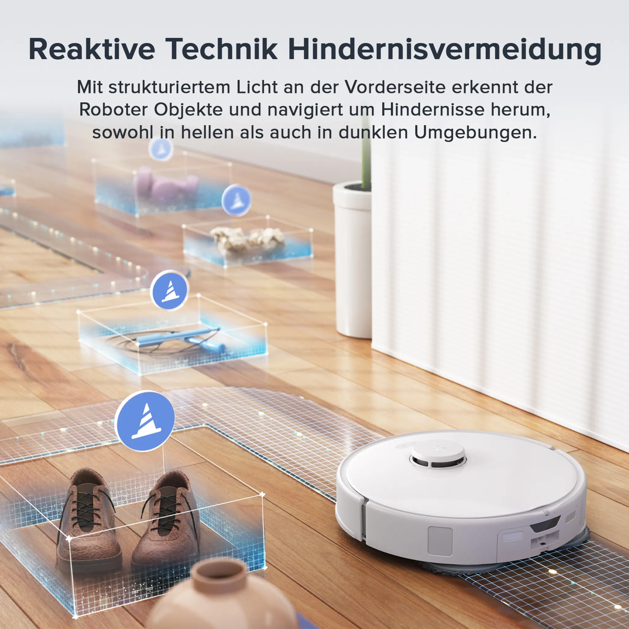 Highlights: Extrem starke 18.500 Pa-Saugkraft, doppelte Anti-Tangle-Technologie, präzise LDS-Navigation, intelligente Schmutzerkennung, Heißwasser-Moppwäsche bei 75 °C und automatische Wartung über die Dockingstation.